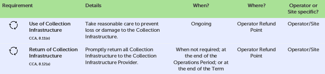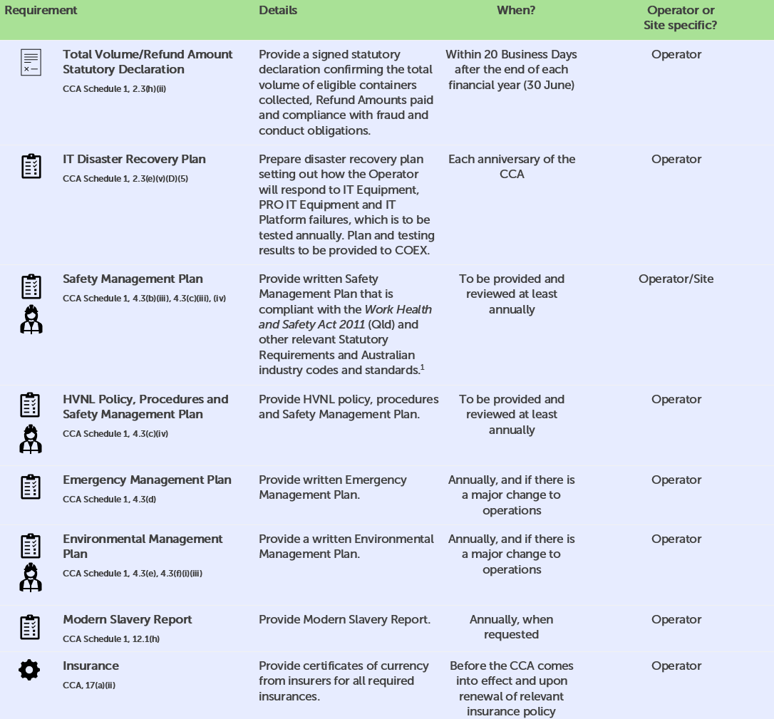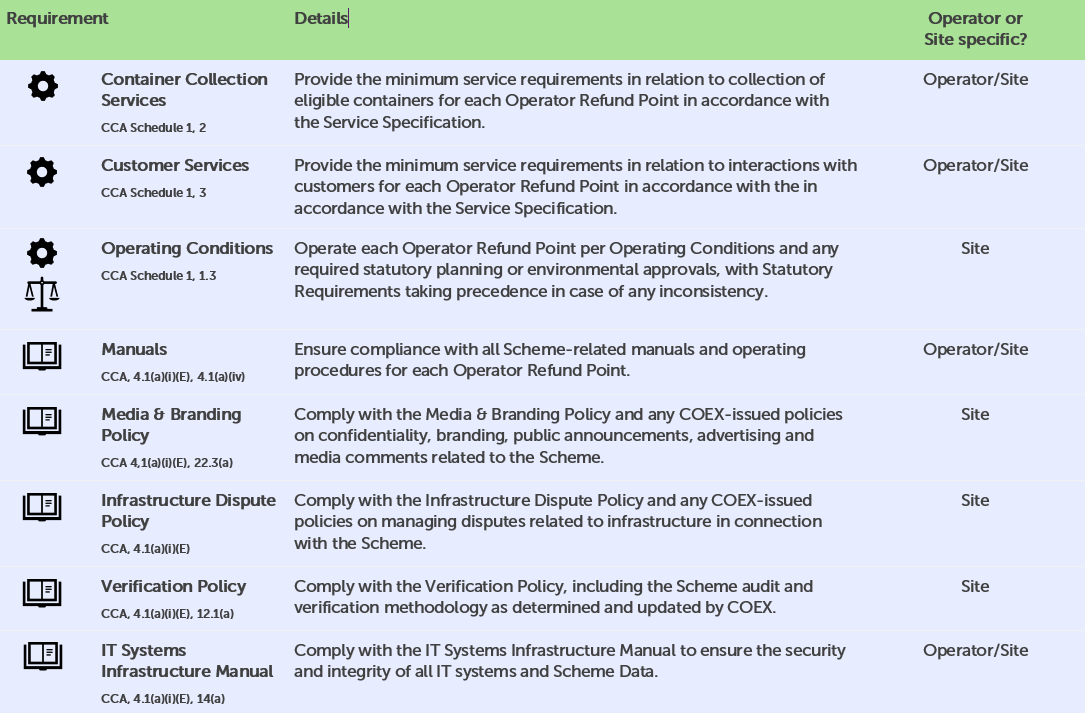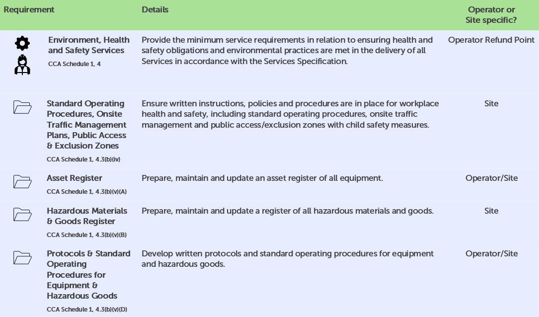 Schedule 1 of the CCA that sets out the minimum service requirements of Operators for container collection services, customer services and environment health and safety services.
