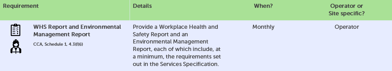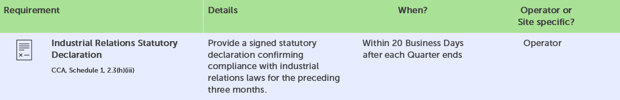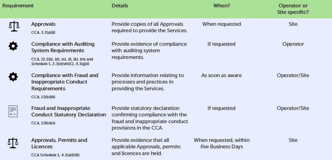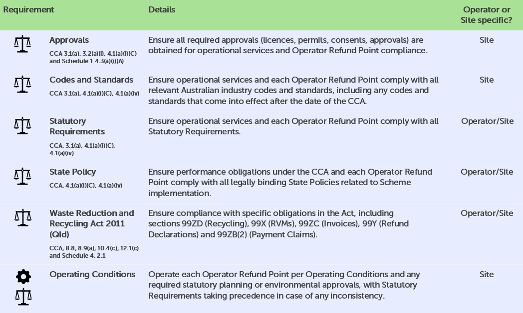 - Approvals (including any condition or requirement under them), applicable to implementation and operation of the Scheme, the provision of the Services or the Operator’s obligations under the CCA; and