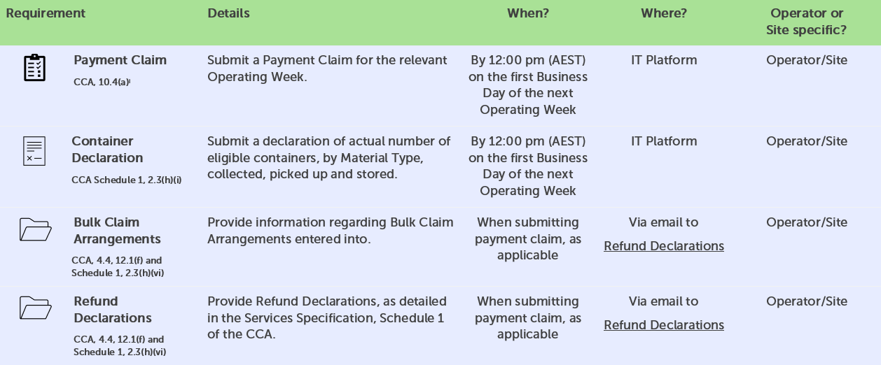 The claim for payment made by the Operator which attaches sufficient details, calculations and supporting documentation, including the number of eligible containers collected during the Operating Week by Material Type, in regard to the amounts claimed by the Operator to enable COEX to fully and accurately determine the amount payable by COEX to the Operator (Payments Schedule – clause 2.1).